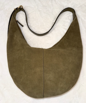 Bag measures roughly 18” w x 12” h and has an adjustable strap. Zip closure with gold tone hardware and gold accents on the sides of the bag. Generously Donated by EJ Evans