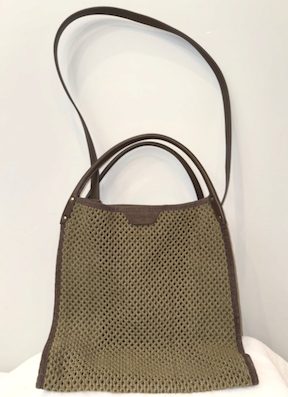 This Rag and Bone Safari Khaki Net Summer Passenger Tote is a crochet-knit tote with leather straps and magnetic closure. Measures roughly 13” w x 13” h x 6” d. Generously Donated by EJ Evans